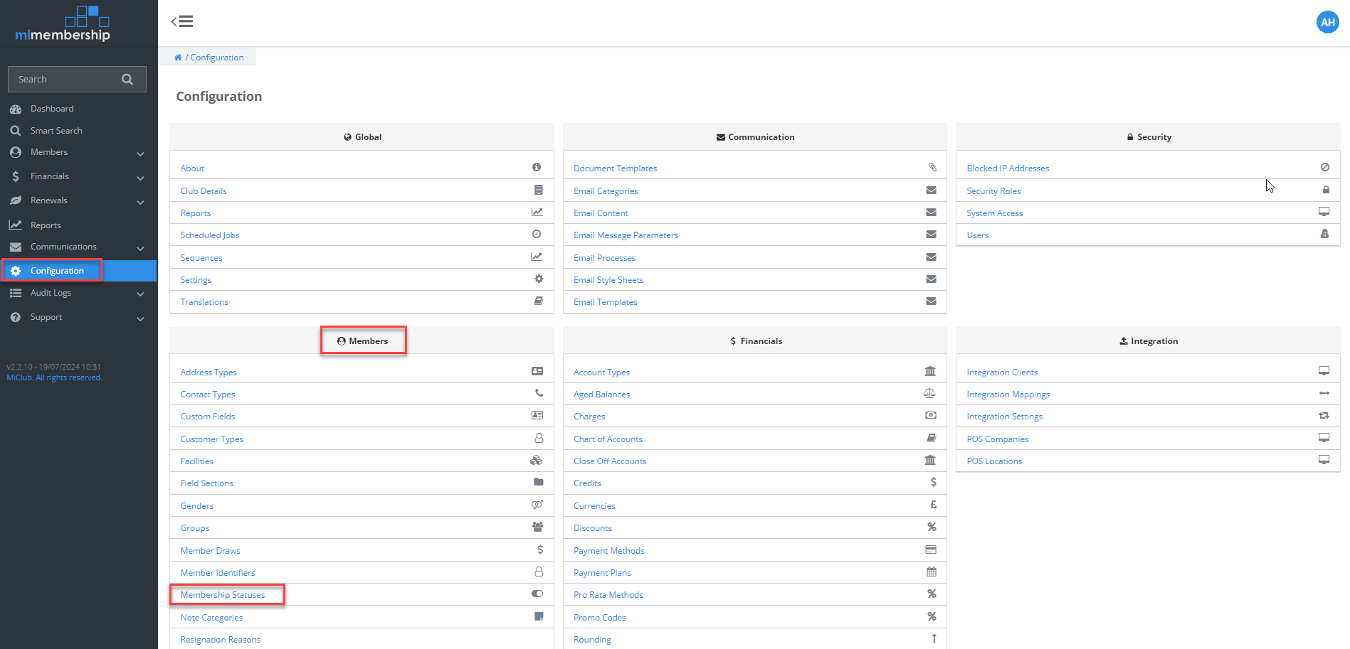Step 1 - Navigate to Configuration and click Membership Statuses under the Members heading
