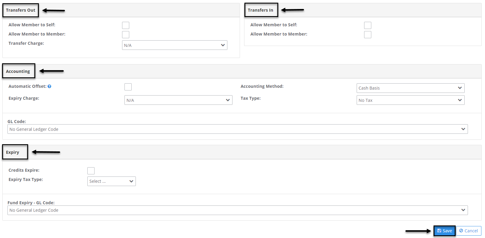 Transfers In, Accounting and Expiry then click the Save button.