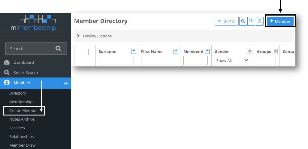 Step 1 - Add Member by selecting the Create Member option under Members menu, or from the Member Directory select the +Member button.