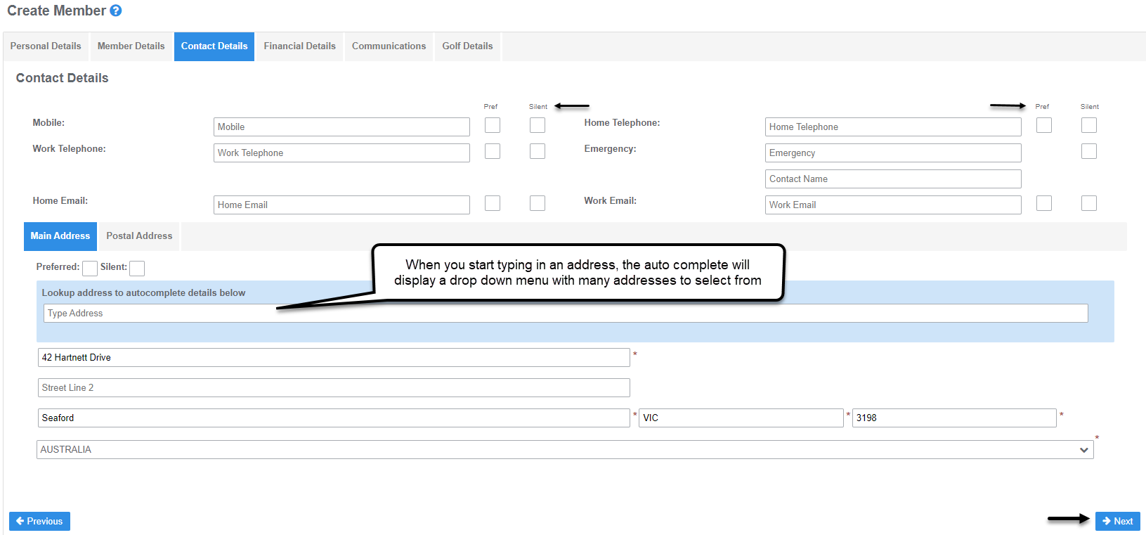 - Select Silent if the contact details are to remain private and hidden from the member's view in the MiClub Golf Members Directory.