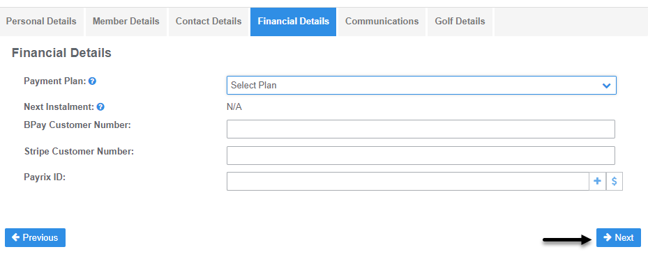 Step 7 - Golf Details will integrate from MiClub Golf. Ignore this section and move to the next tab or select Save