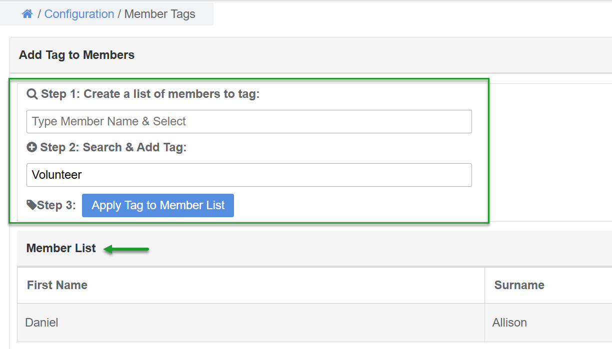 - Click the Apply Tag to Member List button. This action adds the members to the selected tag label