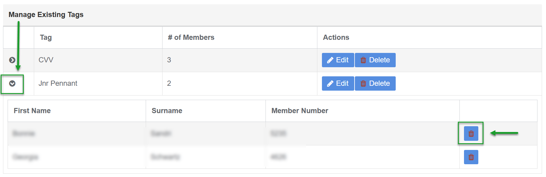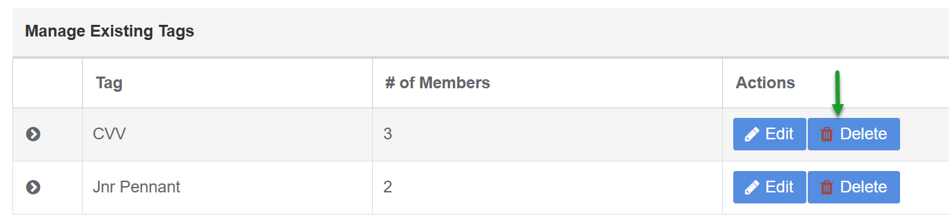 - Under the Manage Existing Tags display click the Display Arrow next to the Tag to view the list of members assigned to the tag