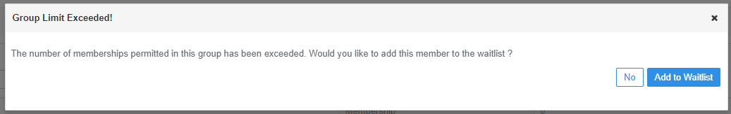 - If this addition exceeds the Group Limit the system will prompt you to add the member to the waitlist - click Add to Waitlist button. The membership Group will be added to the member record with a Waitlist Status