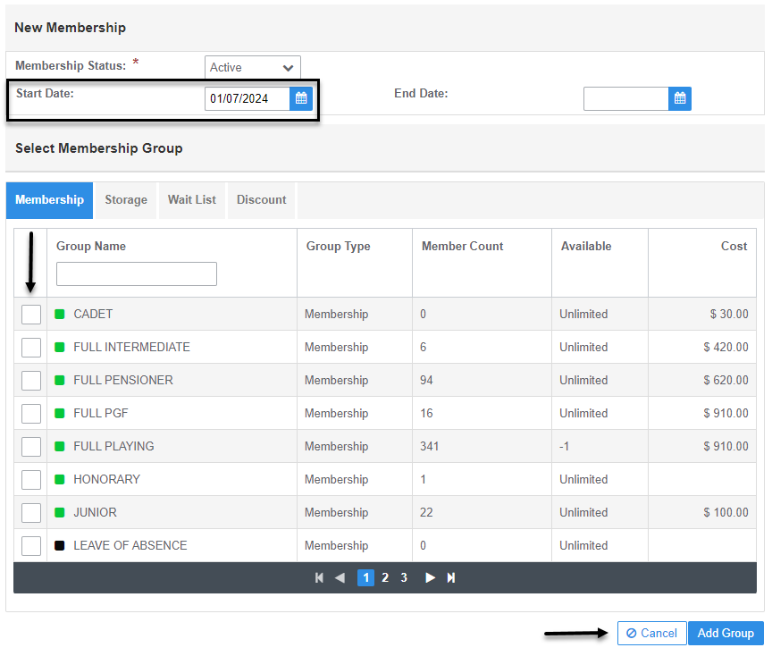 - Enter the Start Date for the membership group, then select the appropriate Group (tick box) and click the Add Group button