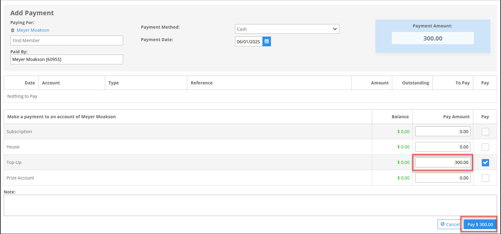 - Enter the Payment Date. Once this information is entered the different member account types and any outstanding invoices will appear below.