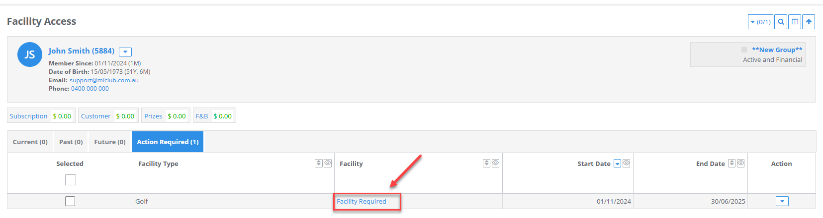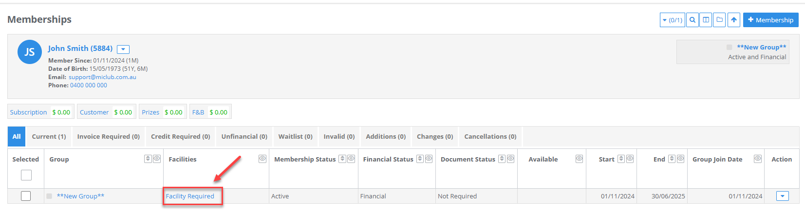 If MiMembership is integrated to the MiClub Golf database all golf memberships require the “golf” facility to be added in configuration settings. Without this facility member records will not integrate to MiClub Golf. As as a result, the member cannot access golf bookings.