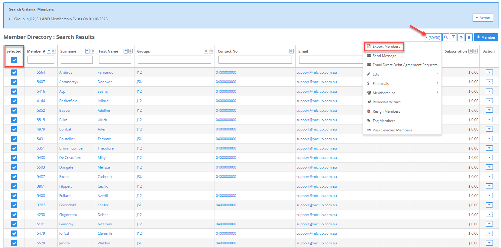 - To Export the results to CSV - tick the Selected all check box and select Export Members from the Bulk Action button menu options