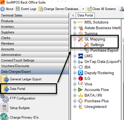 1. Navigate in SwiftPOS BO to Data Changes/Export > Data Portal > GL Mapping > Settings