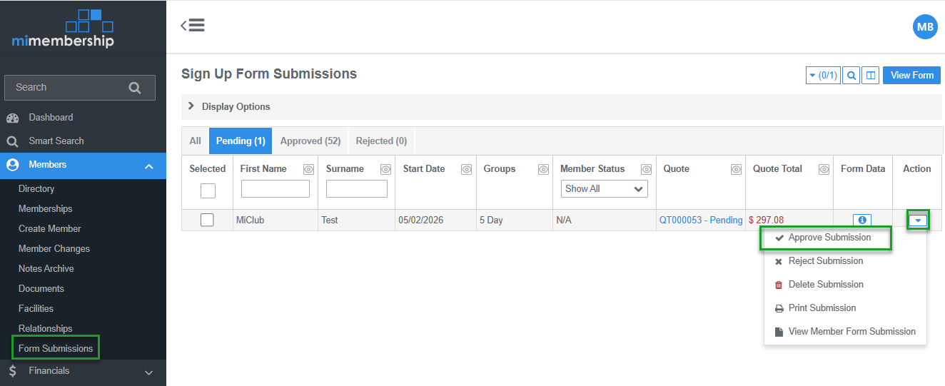 The Form Submission repository displays all pending, previously approved and rejected submissions. Each submission has an information link and action menu. This process is actioned when a prospective new member completes and submits the online MiMembership sign up form.