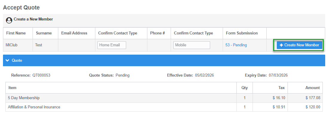 - From the Member Action button select the Approve Submission option - this action opens the Accept Quote screen