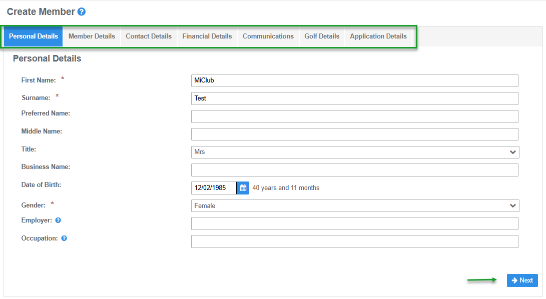 - Click the -> Next button on each of the Details tabs. You can update or add details to the member information fields