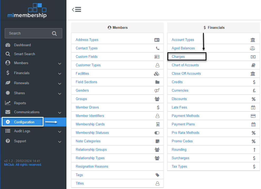 - Navigate to Configuration, and select Charges (located under the Financials section)