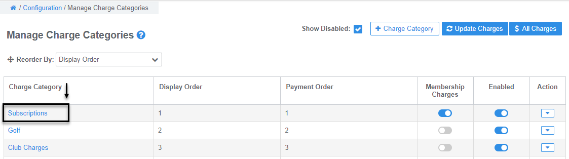 - In the Manage Charge Categories screen, click the Charge Category and toggle the Discount Button ON for each Charge the discount can be applied to