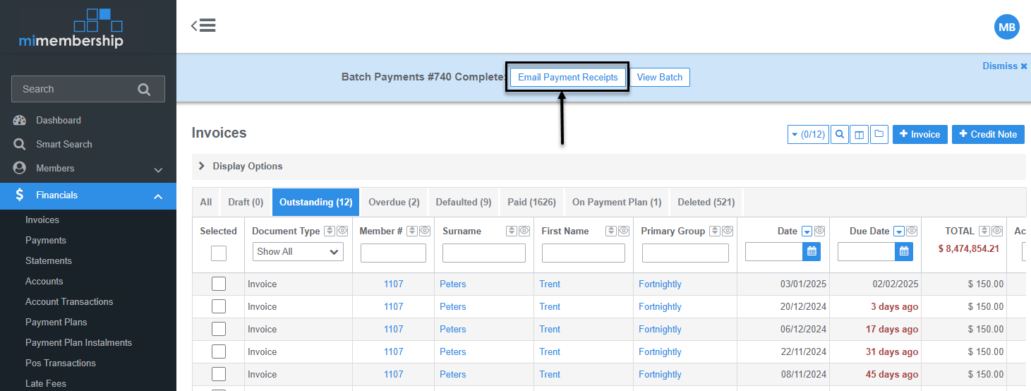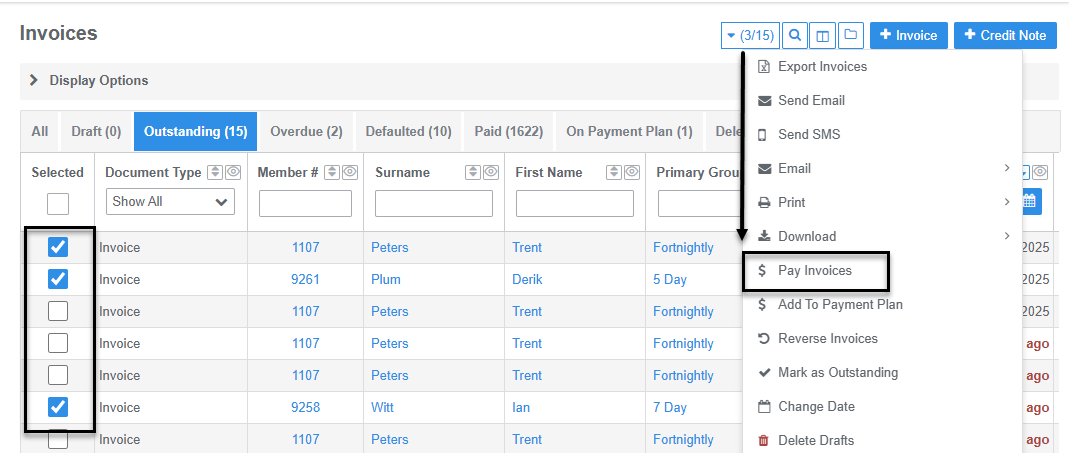 Tip: use the Member # or Name column header filter boxes to search the table for individual invoices - ensure you wait for the Bulk Action counter to refresh before proceeding to use the Bulk Action
