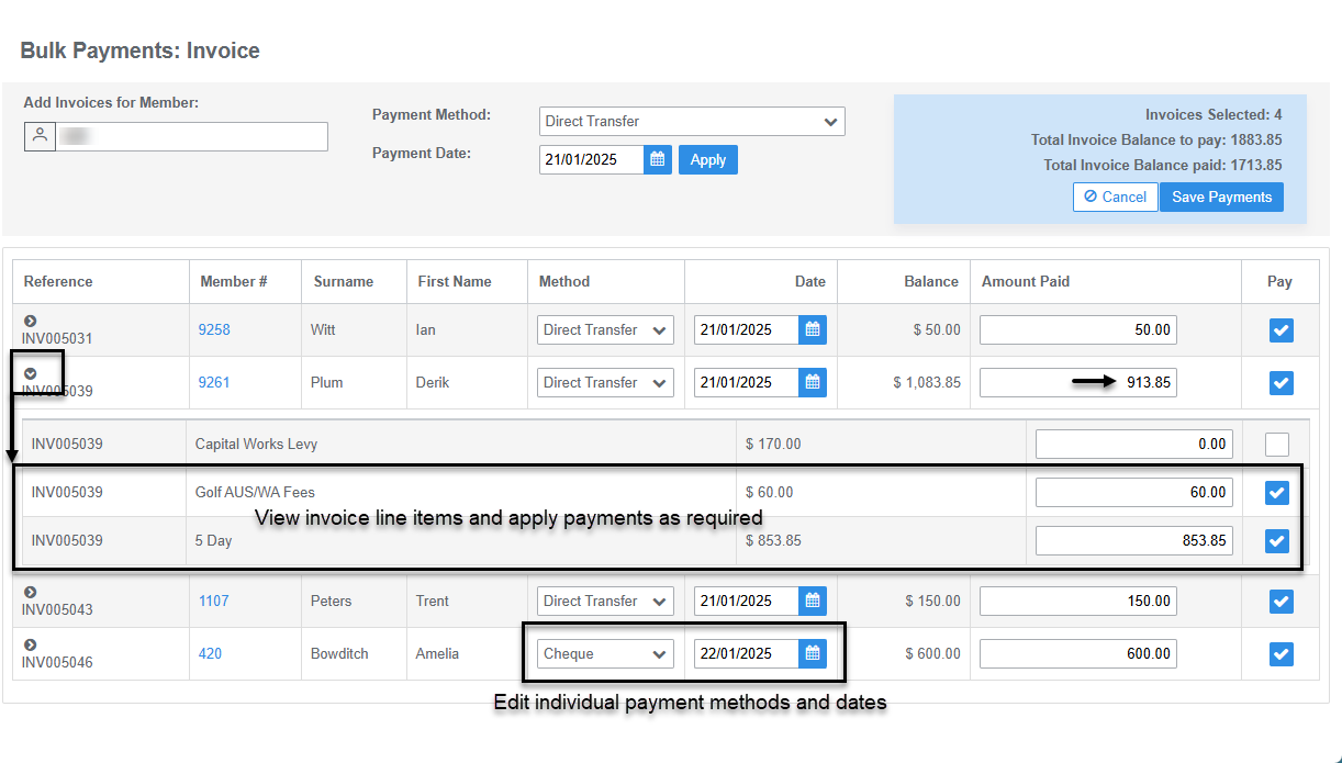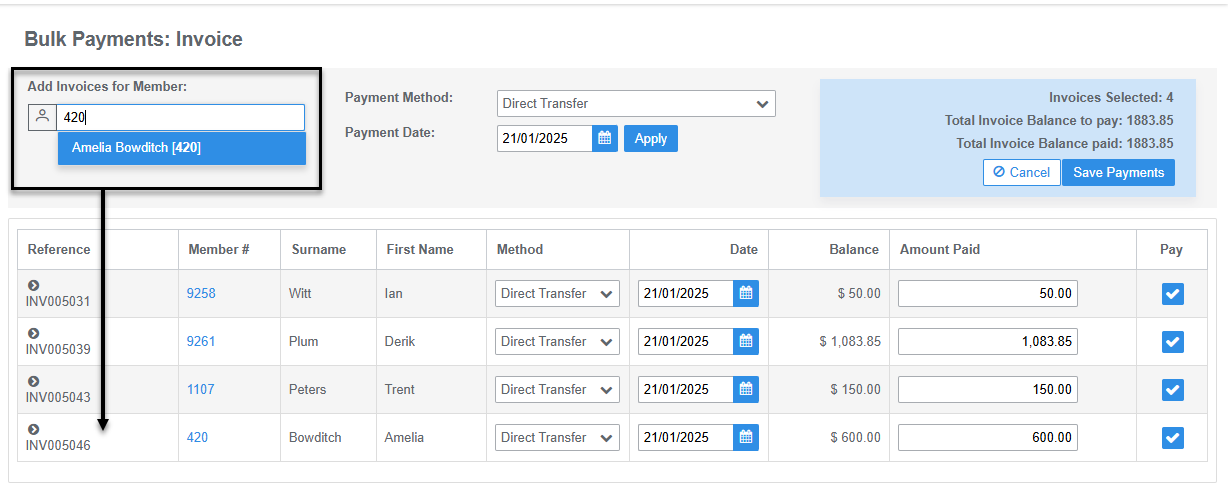 - Add additional invoices to the payment list by using Find Member. Search by member number or member name