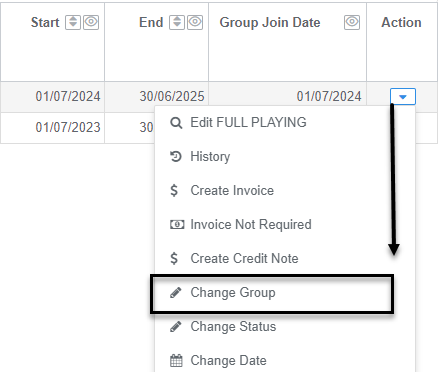 - Select the Change Group option from the Action drop menu for the current paid membership Group (this is the membership Group to be changed).