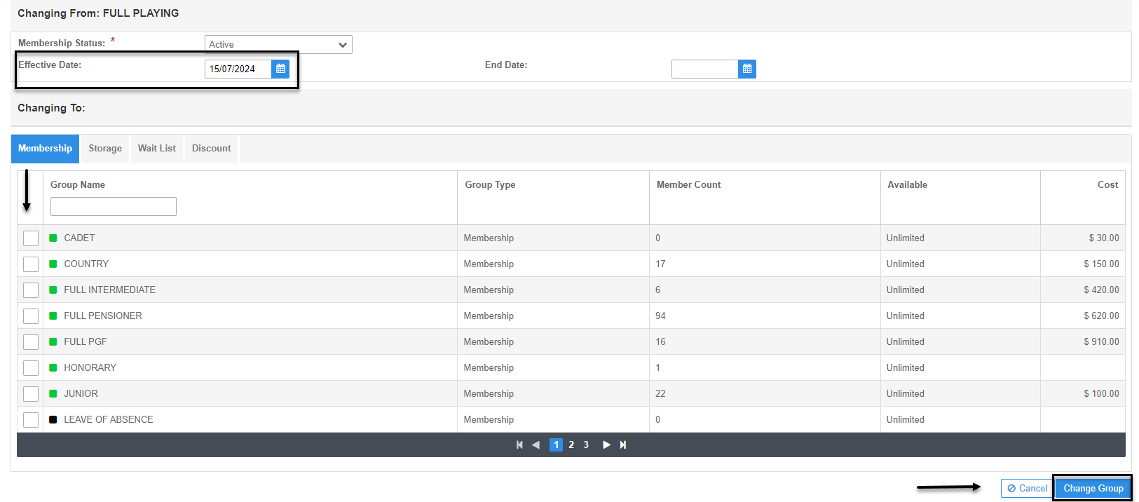 - Set the Effective Date of the group change to the date the change is made (do not back date to the start day of the new membership period).