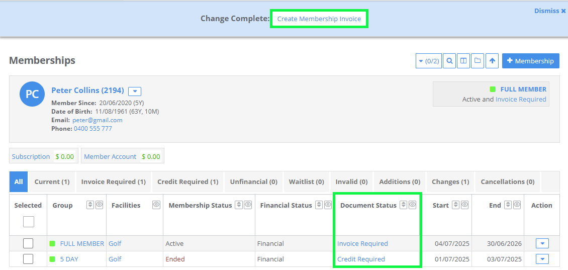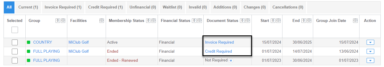 - From the Membership Change Taskbar select Create Membership Invoice, OR click on the Group 'document required status'.