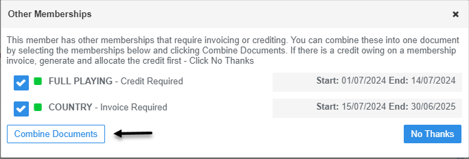 - Tick the membership check boxes and select Combine Documents to combine the credit and the invoice into one document.