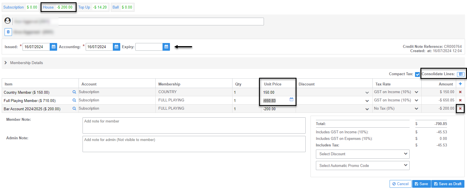 - When combining membership documents we recommend to consolidate duplicate (+/-) invoice charges and remove pre-paid bar or house levy charges that have already been credited to a members bar/house account.