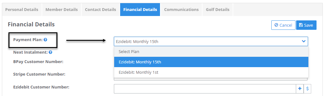 Members that will continue on with direct debits payments and remain on a payment plan for the next membership year will require a payment plan template to be selected in their "financial details"