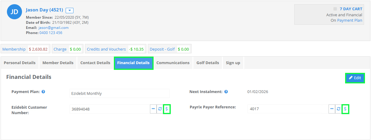 Next to the Ezidebit Customer or Payrix Reference Number, select the $ button.