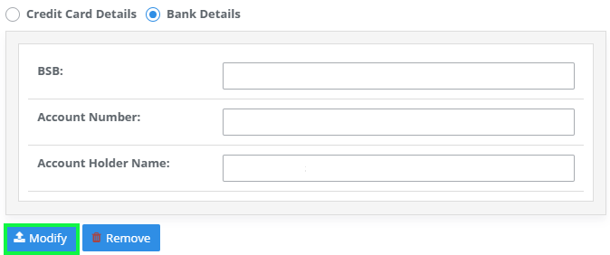 Use the Credit Card or Bank Details button depending on how the member is paying. Click Modify once the details are updated.