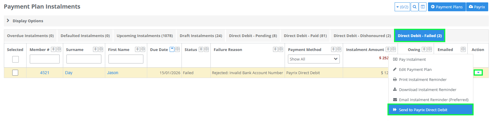 Once updated navigate to the Payment Plan Instalments repository, find the member, select the action button next to the failed instalment and Send to Payrix/Ezidebit Direct Debit.