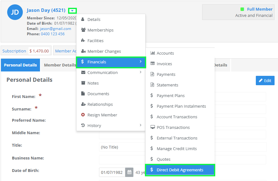 Navigate to the member's Financials and Direct Debit Agreements from the Member Action menu.