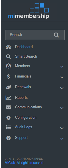The key areas of MiMembership can be accessed through the main menu which is located on the left hand side of the screen. A number of repositories can be accessed from within each key area. Below is a brief description for each of these key areas.