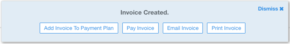 - Task bar after creating an invoice to Add Invoice to Payment Plan, Pay Invoice or Email Invoice