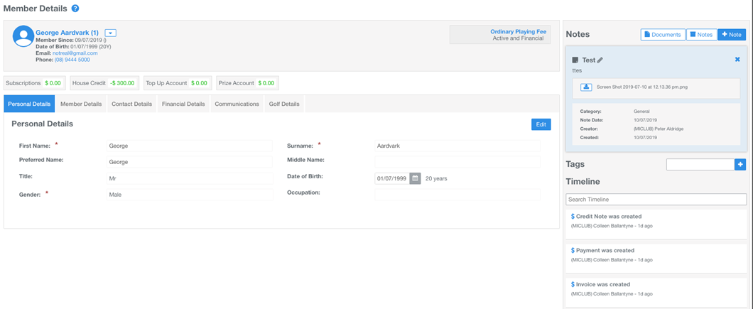 - Field (Tab) Sections: organise your members details into field sections. Default field sections include Personal Details, Member Details, Contact Details, Financial Details, Communication and Golf Details. Click the Edit buttons under each field tab to update information. Custom fields can be created and added to any field section