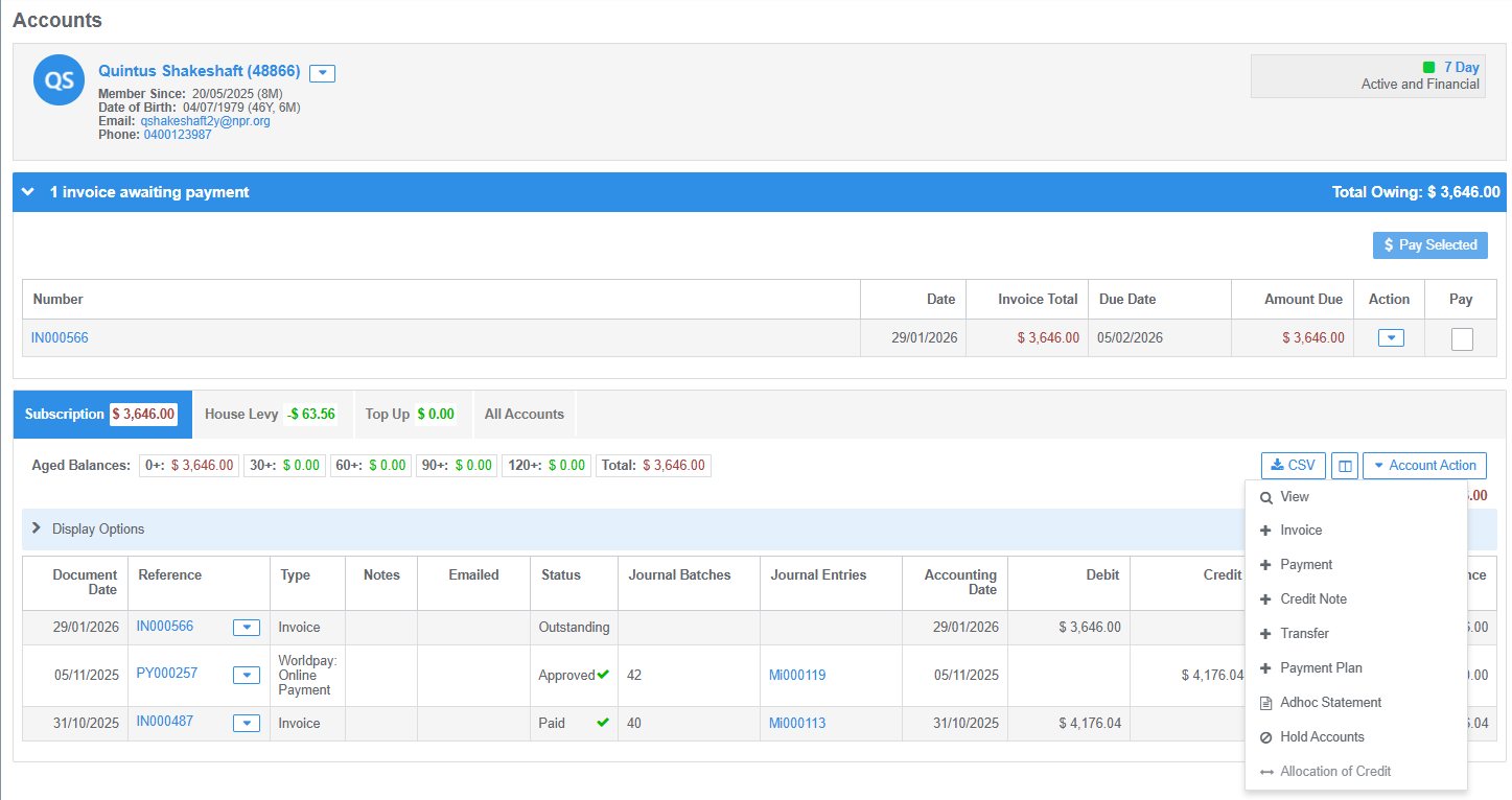 - Account Action: click this button to add payments, create an ad-hoc invoice or credit note, generate a statement, put accounts on hold or action account credit transfers
