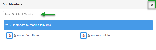- Expand the Members to receive this SMS display to view selected members - click the Bin icon to delete any members from the recipient list