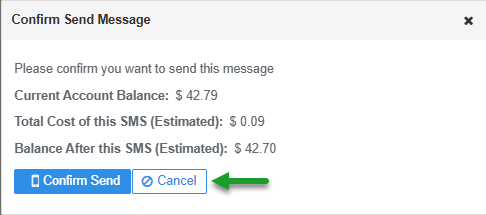 - Check there is enough credit to send your message(s). If the Current Balance is less than the Total Estimated Cost of sending the message click Cancel, top-up the account and return to send the message